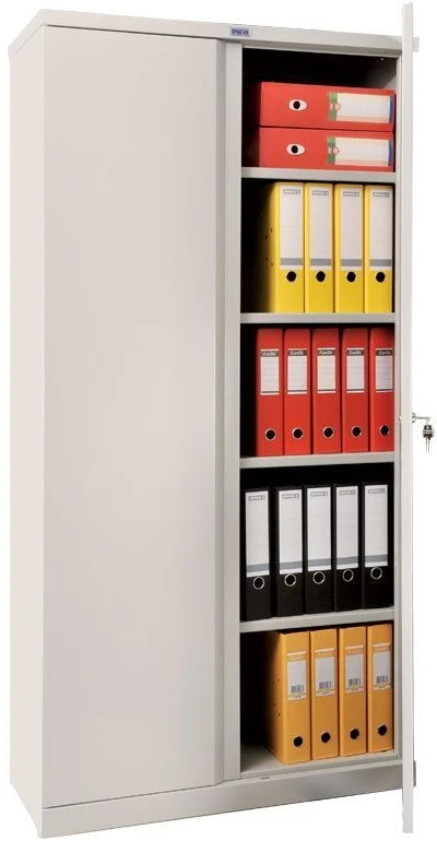 Двухстворчатый металлический шкаф с распашными дверьми, предназначенный для хранения крупных бумажных архивов, финансово-бухгалтерской отчётности и прочей документации в медицинских учреждениях любой направленности.