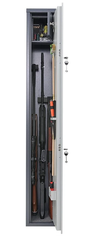 - В верхней части сейфа расположен трейзер (запирающееся на ключ отделение для патронов) размерами 199/147×246×173/90 мм. За узким трейзером остаётся свободное пространство, которое позволяет хранить ружья, по длине соответствующие высоте всего сейфа.