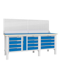 - Рабочее пространство становится более удобным за счёт разнообразных модулей с ящиками и тумбами, а также благодаря возможности установки одной или двух перфорированных панелей для хранения инструментов и навесных элементов.