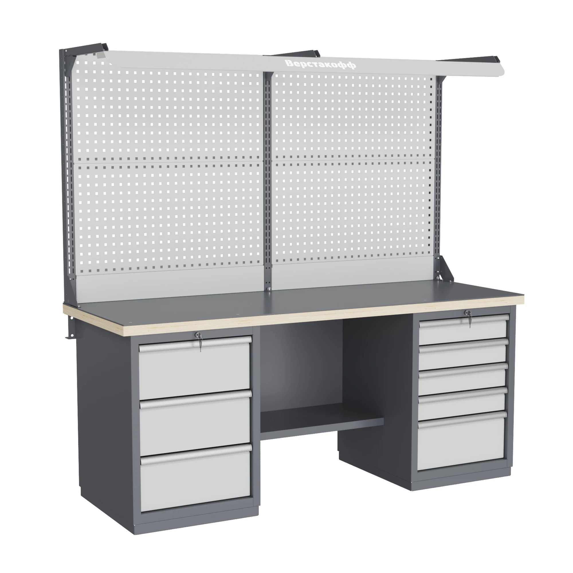 - Рабочее место комплектуется двойным перфорированным экраном, на котором удобно размещать держатели для инструментов, полки и другие навесные элементы, благодаря чему весь необходимый инвентарь всегда будет на виду.